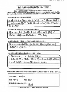 薬なしでは辛かった状況が改善された 患者さんの声2016.02.18 Q1.どのようにして当院をお知りになりましたか?紹介 Q2.他にも施術院がある中で谷本指圧治療院をお選び頂いた理由は何ですか?身近にあったから Q3.ご来院頂く前はどのような症状でお悩みでした... 続きを読む